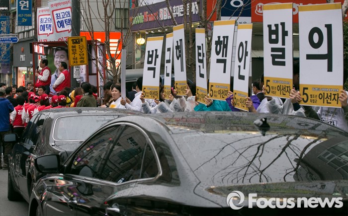 (부산=포커스뉴스) 부산광역시 중구영도구에 출마한 김무성(왼쪽) 새누리당 대표가 3일 오후 부산시 영도구 남항시장 입구에서 유세를 하는 동안, 같은 지역구에 출마한 이선자 무소속 후보 선거운동원들이 피켓을 들고 있다.