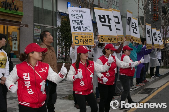 (부산=포커스뉴스) 부산광역시 중구영도구에 출마한 김무성(왼쪽) 새누리당 대표가 3일 오후 부산시 영도구 남항시장 입구에서 유세를 하는 동안, 같은 지역구에 출마한 이선자 무소속 후보 선거운동원들이 피켓을 들고 있다.