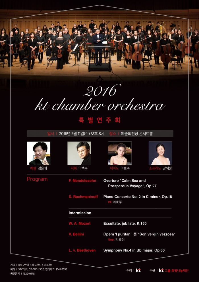 (서울=포커스뉴스) KT가 ‘KT 체임버 오케스트라 특별공연’을 5월11일 수요일 저녁 8시 예술의 전당 콘서트홀에서 개최한다.