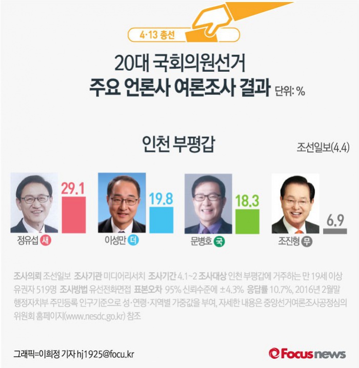 (서울=포커스뉴스) 조선일보가 미디어리서치에 의뢰해 4일 발표한 여론조사 결과에 따르면 새누리당 정유섭 후보의 지지율은 29.1%, 더불어민주당 이성만 후보의 지지율은 19.8%, 국민의당 문병호 후보는 18.3%를 기록했다.