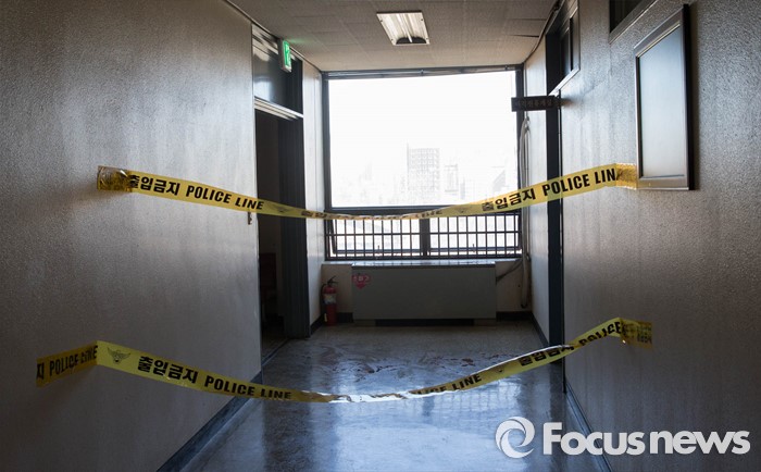(서울=포커스뉴스) 4일 오전 서울 관악구 관악경찰서에서 신원미상의 민원인 여성이 경찰관 4명에게 염산으로 추정되는 액체를 뿌리는 사건이 발생한 가운데 사건 현장에 폴리스 라인이 둘러쳐져있다.