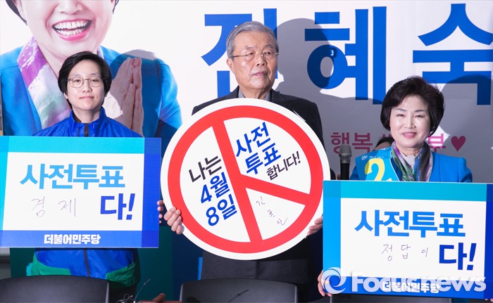 (서울=포커스뉴스) 4일 오전 전혜숙 더불어민주당 서울 광진갑 후보 선거사무소에서 중앙선거대책위원회의에 앞서 김종인(가운데) 비대위 대표 겸 선대위원장, 전(오른쪽) 후보, 장하나 의원이 20대 총선 사전투표 독려 캠페인을 하고 있다.