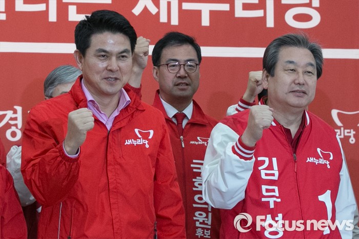 (창원=포커스뉴스) 새누리당 공동선대위원장인 김무성(오른쪽) 대표와 김태호(왼쪽) 최고위원이 4일 오전 경남 창원시 의창구 원이대로 경남도당에서 열린 중앙선대위 현장 대책회의에 참석해 화이팅을 외치고 있다.