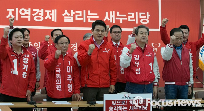 (창원=포커스뉴스) 새누리당 공동선대위원장인 김무성(앞줄 오른쪽 두번째) 대표와 김태호(앞줄 가운데) 최고위원이 4일 오전 경남 창원시 의창구 원이대로 경남도당에서 열린 중앙선대위 현장 대책회의에 참석해 화이팅을 외치고 있다.
