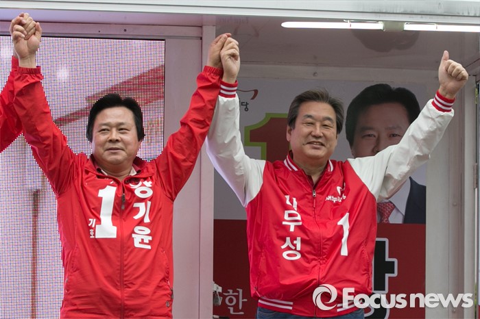 (창원=포커스뉴스) 김무성(오른쪽) 새누리당 대표가 4일 오전 경남 창원시 성산구 가음정시장 앞에서 강기윤 창원시성산 후보 지원유세에 참석해, 강 후보와 손을 들고 있다.