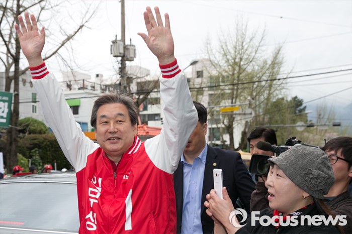 (창원=포커스뉴스) 김무성(오른쪽) 새누리당 대표가 4일 오전 경남 창원시 성산구 가음정시장 앞에서 강기윤 창원시성산 후보 지원유세에 참석해, 손을 흔들고 있다.