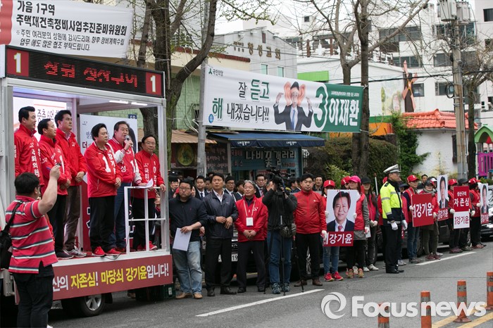 (창원=포커스뉴스) 김무성 새누리당 대표가 4일 오전 경남 창원시 성산구 가음정시장 앞에서 강기윤 창원시성산 후보 지원유세를 하고 있다.