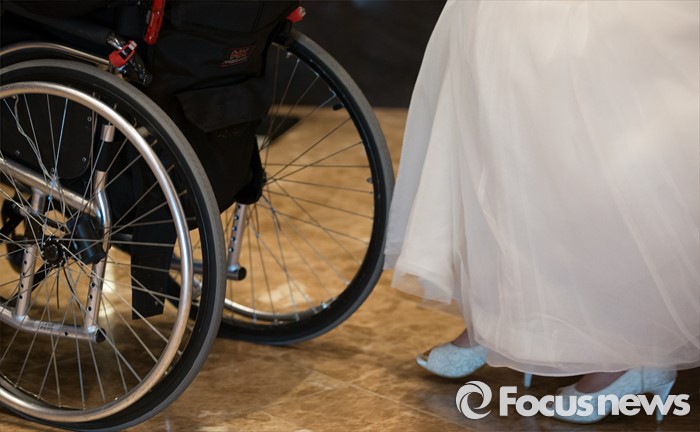 (대전=포커스뉴스) 4일 오전 대전 유성구 호텔ICC에서 열린 제18회 대전장애인자활실천대회 및 합동결혼식에서 신랑과 신부가 결혼식장으로 입장하고 있다.