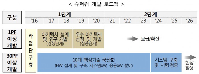 미래부는 우선 기존의 슈퍼컴퓨터 개발경험과 공공부문의 슈퍼컴퓨터 실수요 등 국내 현실을 종합적으로 고려해 2020년까지 해양예보, 산불·산사태 예측 등의 수요를 바탕으로 슈퍼컴을 개발한다. 이후 2025년까지는 4분의 1정도의 전력소모량, 10개 이상의 프로젝트 달성수준의 확장성, HW와 SW가 통합된 범용성 컴퓨터를 구현한다.