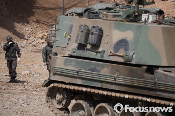 (고성=포커스뉴스) 4일 오전 강원도 고성 야촌리사격장에서 열린 '2016년 전반기 해상사격 훈련'에서 육군 8군단 포병대대 소속 K-9 자주포가 사격을 준비하고 있다.