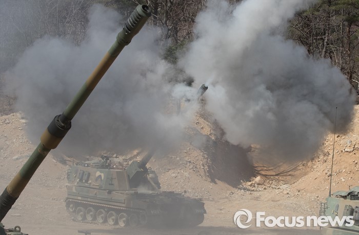 (고성=포커스뉴스) 4일 오전 강원도 고성 야촌리사격장에서 열린 '2016년 전반기 해상사격 훈련'에서 육군 8군단 포병대대 소속 K-9 자주포가 사격을 하고 있다.
