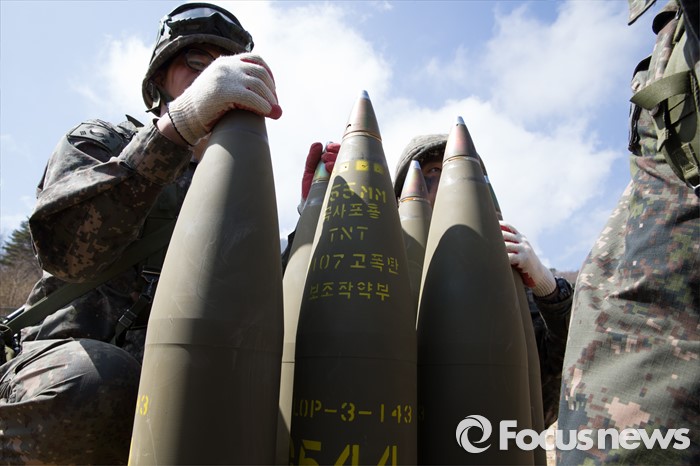(고성=포커스뉴스) 4일 오전 강원도 고성 야촌리사격장에서 열린 '2016년 전반기 해상사격 훈련'에서 육군 8군단 포병대대 소속 장병들이 155mm 견인포로 훈련을 하고 있다.