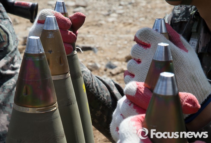 (고성=포커스뉴스) 4일 오전 강원도 고성 야촌리사격장에서 열린 '2016년 전반기 해상사격 훈련'에서 육군 8군단 포병대대 소속 장병들이 155mm 견인포로 훈련을 하고 있다.