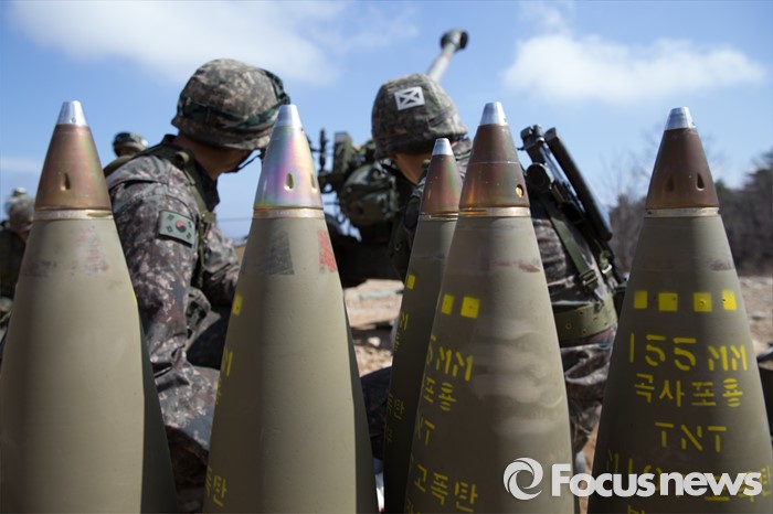 (고성=포커스뉴스) 4일 오전 강원도 고성 야촌리사격장에서 열린 '2016년 전반기 해상사격 훈련'에서 육군 8군단 포병대대 소속 장병들이 155mm 견인포로 훈련을 하고 있다.