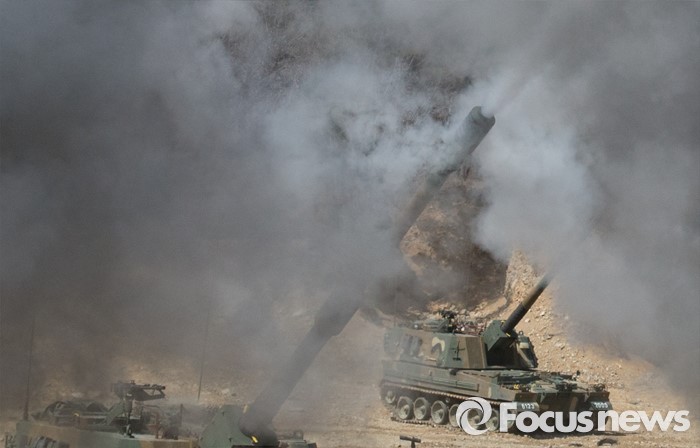 (고성=포커스뉴스) 4일 오전 강원도 고성 야촌리사격장에서 열린 '2016년 전반기 해상사격 훈련'에서 육군 8군단 포병대대 소속 K-9 자주포가 사격을 하고 있다.