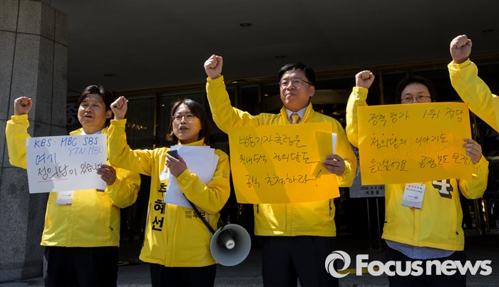 표서울=포커스뉴스) 4일 오후 서울 종로구 세종문화회관 앞에서 열린 '정의당, 방송기자클럽 초청 토론회 배제에 대한 항의 긴급기자회견'에 참석한 이혁재 사무총장과 추혜선 비례후보를 비롯한 당직자들이 구호를 외치고 있다.