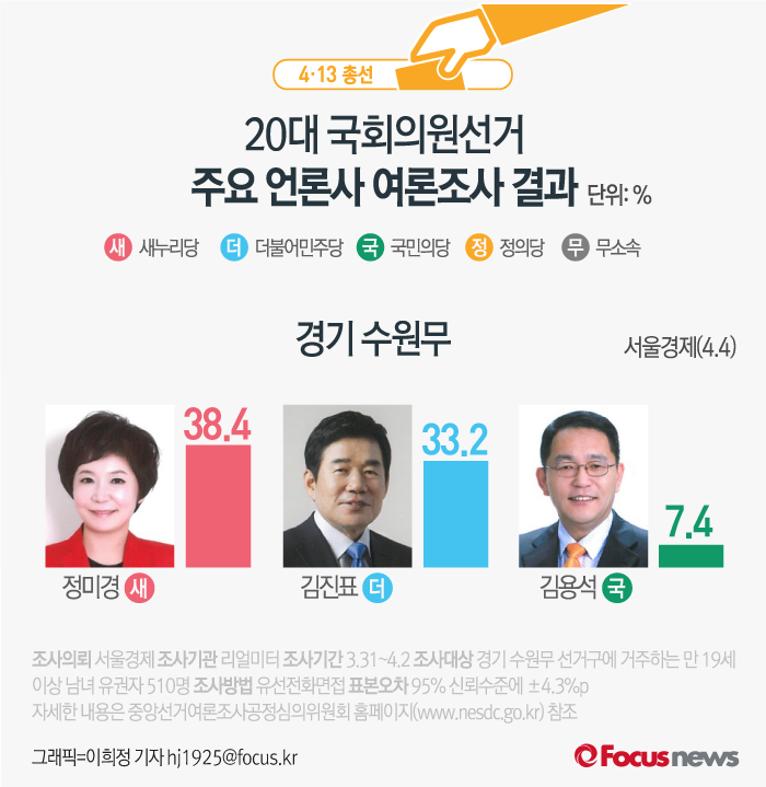 (서울=포커스뉴스) 서울경제가 리얼미터에 의뢰해 4일 발표한 여론조사 결과에 따르면 새누리당 정미경 후보의 지지율은 38.4%, 더불어민주당 김진표 후보의 지지율은 33.2%, 국민의당 김용석 후보는 7.4%를 기록했다.