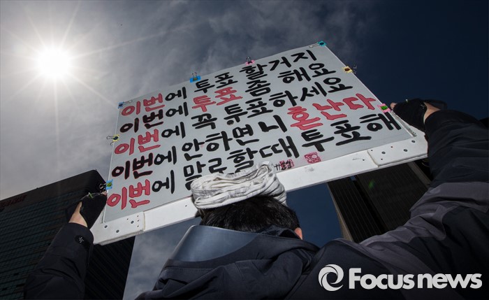 (서울=포커스뉴스) 4일 오후 서울 광화문광장에서 한 시민이 투표를 독려하는 손팻말을 들고 있다.