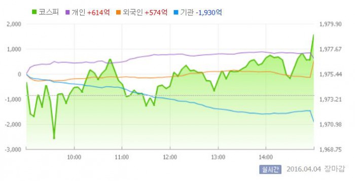 이날 코스피는 저가 매수세 유입으로 상승세로 장을 시작했다. 그러나 외국인과 기관의 동반 매도세에 약보합으로 전환한 뒤 등락을 반복했다. 지수는 장 막판 외국인의 매수 전환에 힘입어 상승 마감했다.
