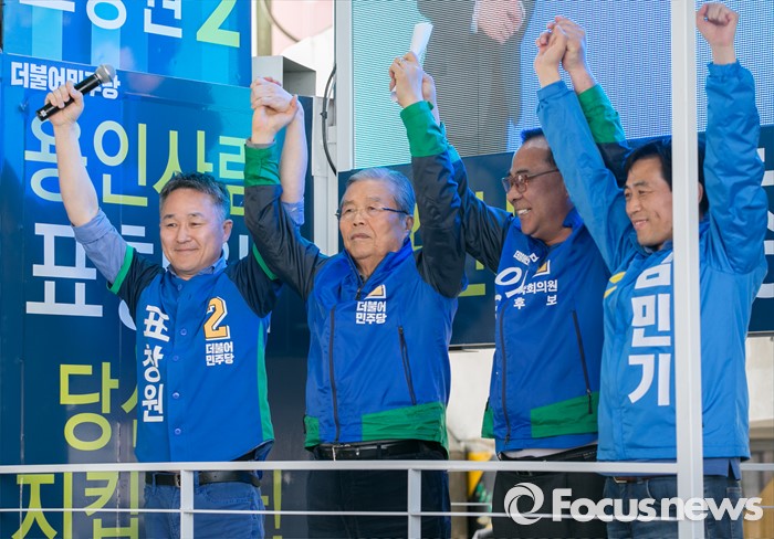 (용인=포커스뉴스) 4일 오후 경기도 이마트 죽전점 앞 광장에서 열린 더불어민주당 용인지역 합동유세에 참석한 김종인 비대위 대표 겸 선대위원장과 후보들이 손을 들어 취재진을 향해 포즈를 취하고 있다. 왼쪽부터 표창원 용인정 후보, 김 대표, 이우현 용인병, 김민기 용인을 후보.