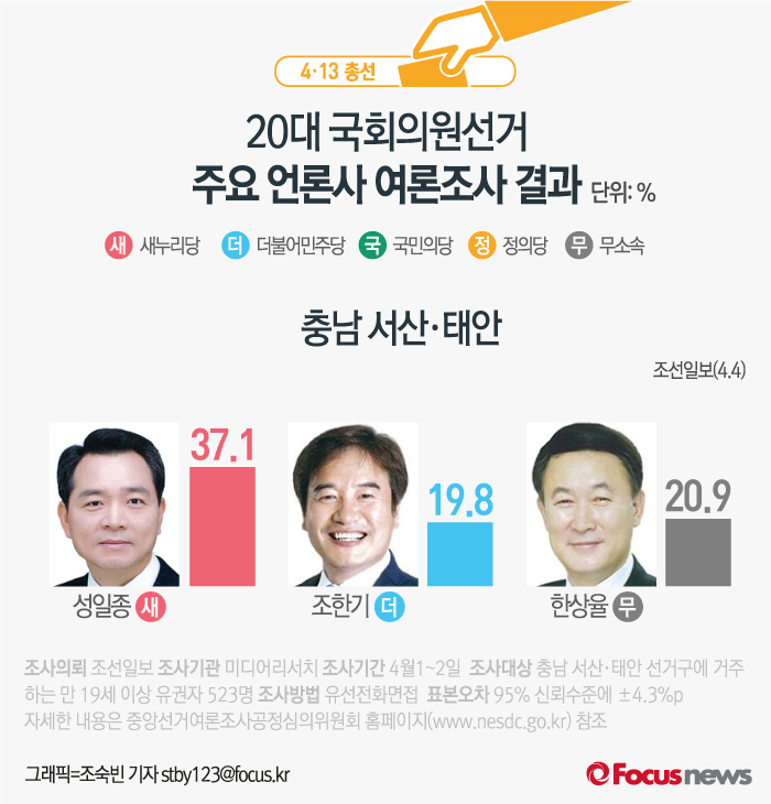 (서울=포커스뉴스) 조선일보가 여론조사기관 미디어리서치에 의뢰해 4일 발표한 결과에 따르면 충남 서산·태안 선거구 후보 지지율은 새누리당 성일종 후보 37.1%, 무소속 한상율 후보 20.9%, 더불어민주당 조한기 후보 19.8% 순으로 조사됐다.