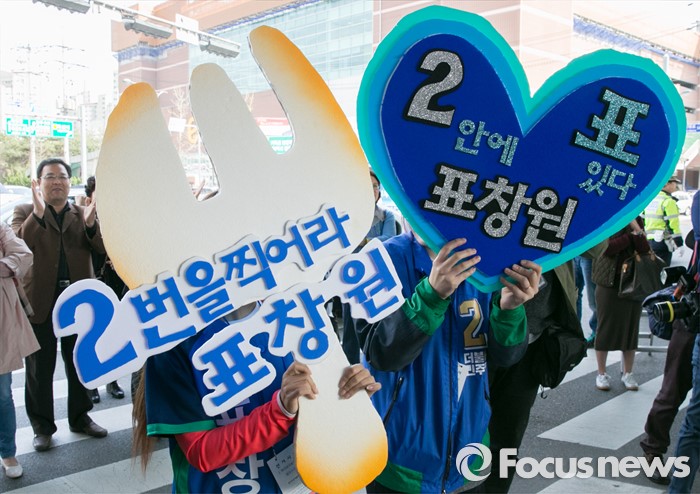 (용인=포커스뉴스) 4일 오후 경기도 이마트 죽전점 앞 광장에서 피켓을 든 선거운동원들이 더불어민주당 용인지역 합동유세를 지켜보고 있다.