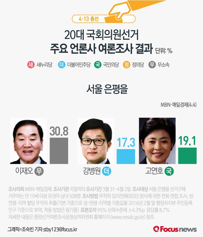 이번 여론조사는 1~2일 은평을 선거구에 거주하는 만 19세 이상 남녀 500명을 대상 유선전화면접조사 방식으로 진행됐다. 표본오차는 95% 신뢰수준에 ±4.4%포인트다. 자세한 내용은 중앙선거여론조사공정심의위원회 홈페이지(www.nesdc.go.kr)에서 찾아볼 수 있다.(서울=포커스뉴스) MBN과 매일경제가 공동으로 리얼미터에 의뢰해 3월 31일부터 4월 2일까지 서울 은평을 선거구에 거주하는 유권자 508명을 대상으로 여론조사를 실시한 결과, 무소속 이재오 후보의 지지율이 30.8%, 더민주 강병원 후보와 국민의당 고연호 후보의 지지율은 각각 17.3%, 19.1%인 것으로 나타났다. 2016.04.04 조숙빈 기자