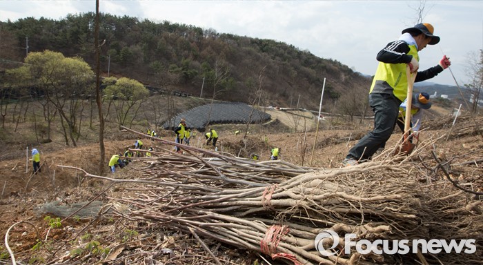(세종=포커스뉴스) 김경환 국토교통부차관과 직원들이 식목일을 앞두고 4일 오후 세종시 금남면 영곡리 야산에서 나무심기를 하고 있다.