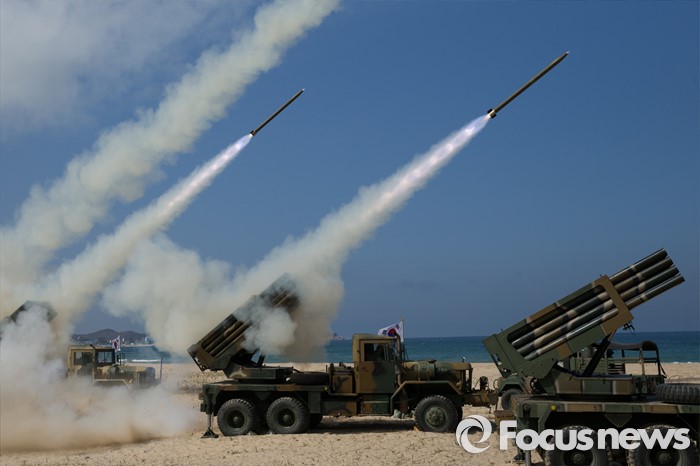 (고성=포커스뉴스) 4일 오후 강원도 고성 송지호해변에서 열린 '2016년 전반기 해상사격 훈련'에서 육군 8군단 포병대대 소속 130mm 다련장 구룡이 로켓탄을 발사하고 있다.