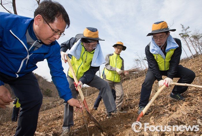 (세종=포커스뉴스) 김경환 국토교통부차관과 직원들이 식목일을 앞두고 4일 오후 세종시 금남면 영곡리 야산에서 나무심기를 하고 있다.