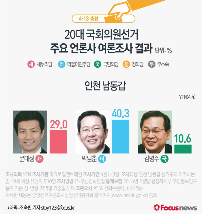 (서울=포커스뉴스) 4·13총선이 9일 남은 가운데 인천 남동갑에 출마한 현역 박남춘 더불어민주당 의원이 문대성 새누리당 의원과 김명수 국민의당 후보에 앞서고 있는 것으로 나타났다.