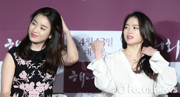 (서울=포커스뉴스) 한효주와 천우희는 '해어화'에서 친구에서 연적이 된다. 하지만 4일 서울 광진구 롯데시네마 건대입구에서 진행된 언론시사회 현장에 참석한 두 사람은 오묘한 분위기를 풍겼다. 극 중 이미지처럼 유연석을 중간에 두고 질투를 벌이면서도, 서로에 대한 말랑말랑한 분위기를 이어가기도 했다.
