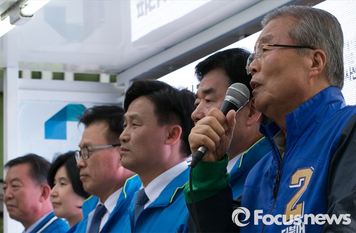 (수원=포커스뉴스) 4일 오후 경기도 수원 팔달문시장 앞에서 열린 더불어민주당 수원지역 합동유세에 참석한 김종인 비대위 대표 겸 선대위원장이 지지를 호소하고 있다. 왼쪽부터 이찬열 수원갑, 백혜련 수원을, 박광온 수원정, 김영진 수원병, 김진표 수원무 후보, 김 대표.