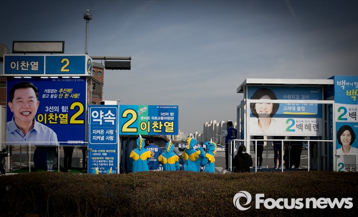 (수원=포커스뉴스) 4일 오후 경기도 지하철 1호선 성균관대역 앞에서 열린 더불어민주당 수원지역 합동유세에 앞서 인형옷을 입은 유세단원들이 휴식을 취하고 있다.
