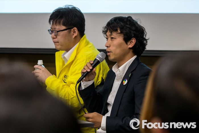 (서울=포커스뉴스) 녹색당 서대문갑 김영준 후보가 4일 오후 서울 서대문구 연세대학교에서 열린 '제20대 국회의원 선거 서대문갑 후보자 토론회'에 참석해 공약 발표를 하고 있다.