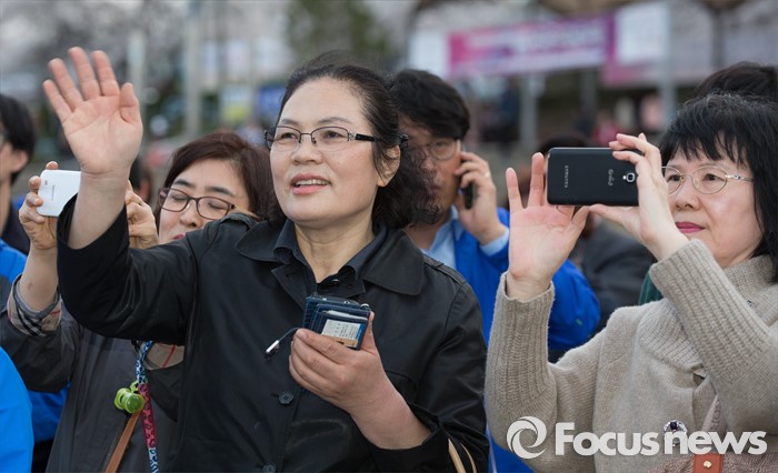(청주=포커스뉴스) 4일 오후 충북 청주 무심천인라인스케이트장에서 문재인 더불어민주당 전 대표의 지지호소에 시민들이 환호하고 있다.