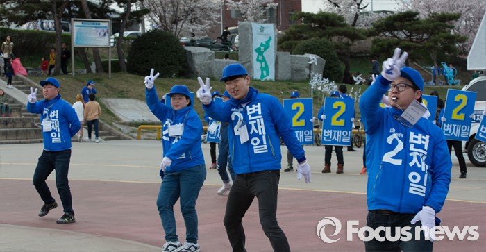 (청주=포커스뉴스) 4일 오후 충북 청주 무심천인라인스케이트장에서 더불어민주당 선거운동원들이 지지를 호소하고 있다.