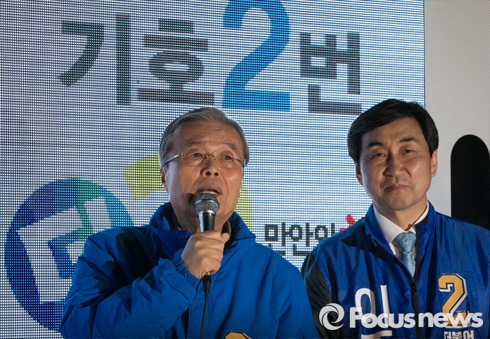 (안양=포커스뉴스) 4일 오후 경기도 지하철 1호선 안양역 앞 광장에 김종인(왼쪽) 더불어민주당 비대위 대표 겸 선대위원장이 안양 만안구 후보인 이종걸 원내대표의 지원유세에 나서 지지를 호소하고 있다.