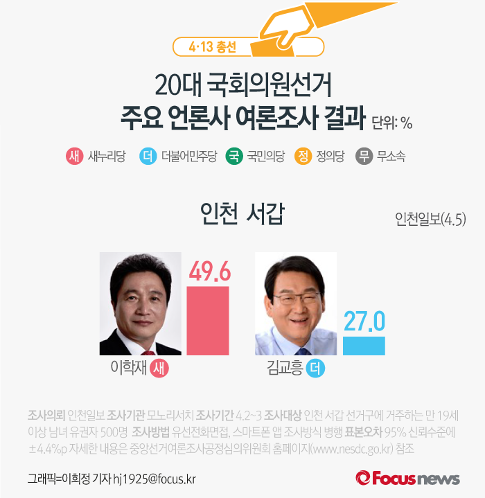 (서울=포커스뉴스) 인천일보가 모노리서치에 의뢰해 5일 발표한 여론조사 결과에 따르면 새누리당 이학재 후보의 지지율은 49.6%, 더불어민주당 김교흥 후보의 지지율은 27.0%를 기록했다.