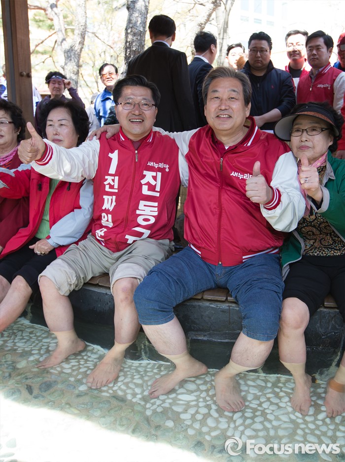 (대전=포커스뉴스) 김무성 새누리당 대표가 5일 오전 대전 유성구 족욕체험장 일원에서 진동규 후보의 지지를 호소하고 있다.