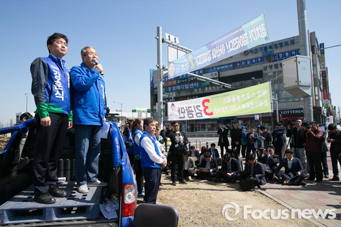 (아산=포커스뉴스) 5일 오전 충남 아산시 배방읍사무소 앞 사거리에서 김종인(오른쪽) 더불어민주당 비대위 대표 겸 선대위원장이 강훈식 아산을 후보의 지지를 호소하고 있다.