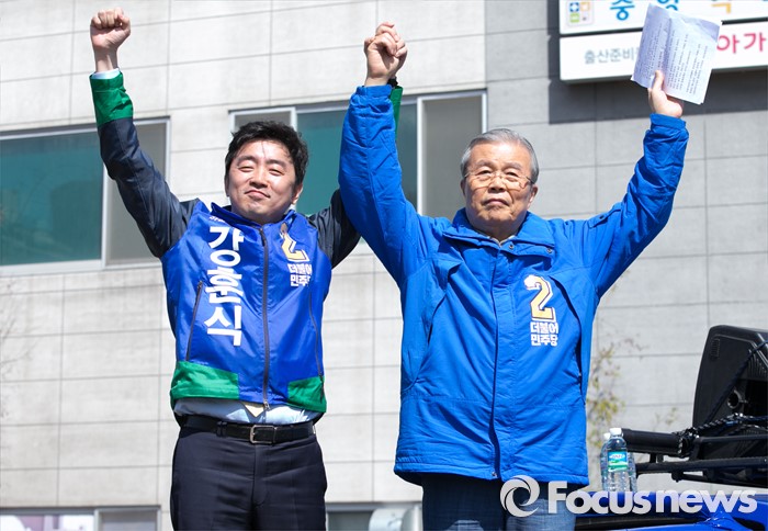 (아산=포커스뉴스) 5일 오전 충남 아산시 배방읍사무소 앞 사거리에서 김종인(오른쪽) 더불어민주당 비대위 대표 겸 선대위원장이 강훈식 아산을 후보의 지지를 호소하며 손을 들어 인사하고 있다.