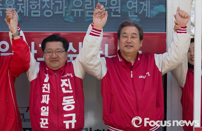 (대전=포커스뉴스) 김무성 새누리당 대표가 5일 오전 대전 유성구 족욕체험장 일원에서 진동규 후보의 지지를 호소하고 있다.