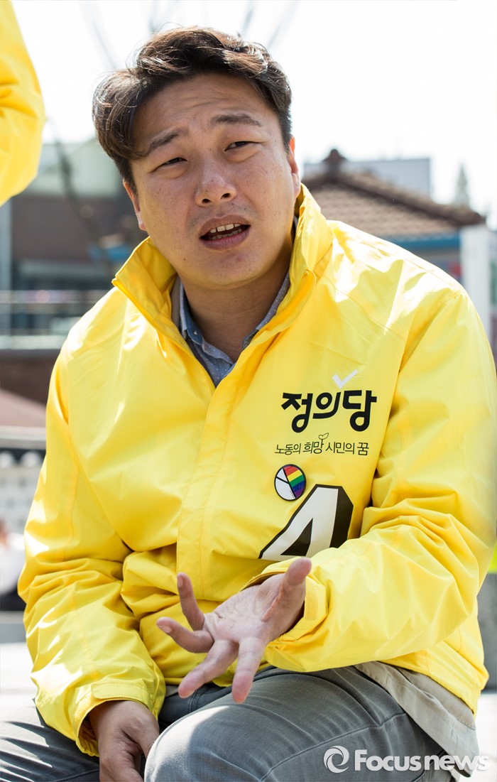 (서울=포커스뉴스) 5일 오전 서울 종로구 성균관대학교 정문 앞에서 조성주 정의당 비례후보가 대학생들과 간담회를 하고 있다.