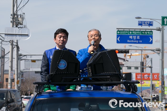 (아산=포커스뉴스) 5일 오전 충남 아산시 배방읍사무소 앞 인근 거리에서 김종인(오른쪽) 더불어민주당 비대위 대표 겸 선대위원장과 강훈식 아산을 후보가 유세를 마친 뒤 차량에 올라 지지를 호소하고 있다.