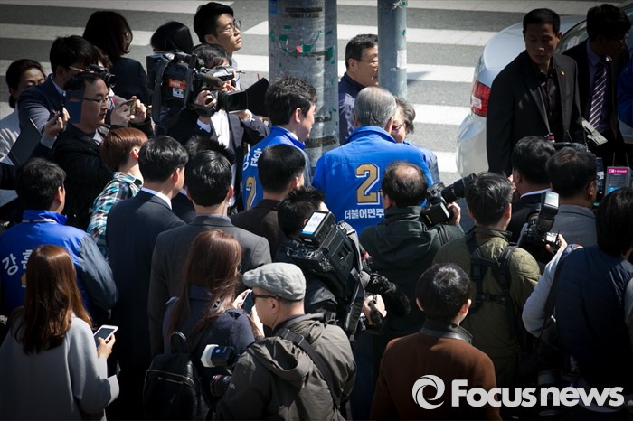 (아산=포커스뉴스) 5일 오전 충남 아산시 배방읍사무소 앞 사거리에서 김종인(오른쪽) 더불어민주당 비대위 대표 겸 선대위원장과 강훈식 아산을 후보가 유세를 마친 뒤 시민 및 지지자들과 인사하며 지지를 호소하고 있다.