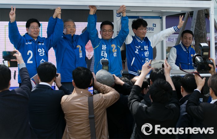 (천안=포커스뉴스) 5일 오전 충남 천안시 신세계백화점 앞에서 열린 더불어민주당 천안지역 합동유세에 참석한 김종인 비대위 대표 겸 선대위원장과 후보들이 손을 들어 인사하고 있다. 왼쪽부터 양승조 천안병 후보, 김 대표, 한태선 천안갑, 박완주 천안을 후보.