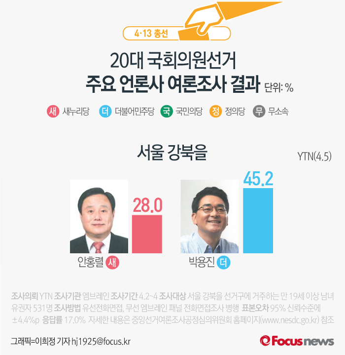 (서울=포커스뉴스) YTN이 엠브레인에 의뢰해 5일 발표한 여론조사 결과에 따르면 새누리당 안홍렬 후보의 지지율은 28.0%, 더불어민주당 박용진 후보는 45.2%를 기록했다.