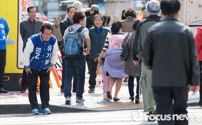 (서울=포커스뉴스) 5일 오후 서울 관악구 서울대입구역 인근에서 유기홍 더불어민주당 관악구갑 후보가 선거유세를 하고 있다.