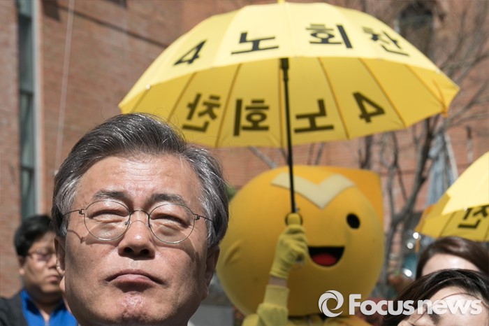 (창원=포커스뉴스) 문재인 전 더불어민주당 대표가 5일 오후 경남 창원시 성산구 반송시장에서 노회찬 정의당 창원성산 후보 지원유세에 참석하고 있다. 노 후보는 창원성산에서 허성무 더불어민주당 후보와 경합에서 승리해, 더민주 · 정의당 단일후보로 출마한다.